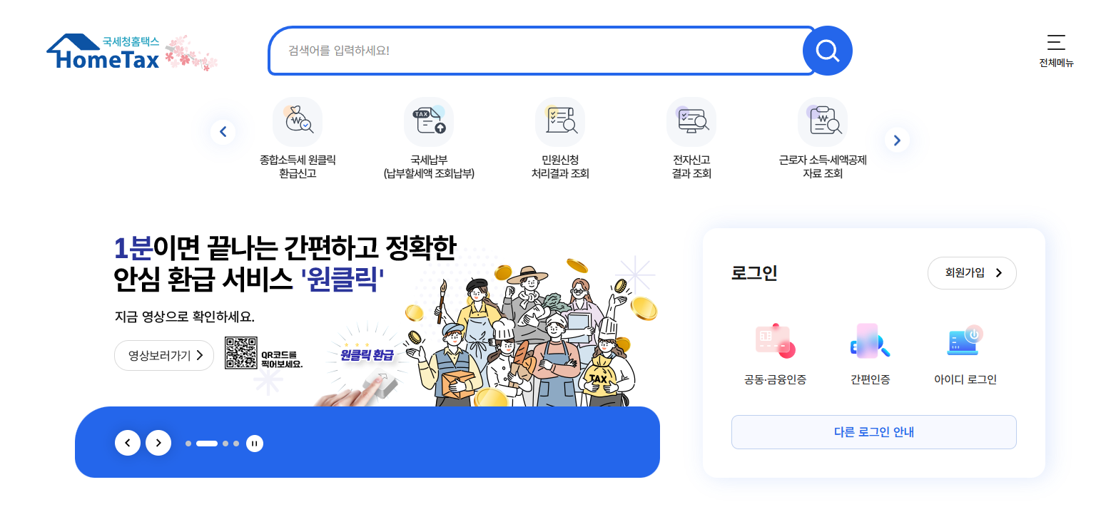 국세청, 종합소득세 환급 서비스 ‘원클릭’ 개통국세청(청장 강민수)은 2025년 3월 31일(월), 편리하고 정확하며 수수료 부담 없는종합소득세 환급 서비스 **‘원클릭’**을 개통했습니다.‘원클릭’ 서비스는 최대 5년 치 환급금액을 한 번에 조회하고,클릭 한 번으로 환급 신청을 마칠 수 있는 혁신적인 서비스입니다.국세청의 환급 지원 노력2022년부터 배달라이더·학원강사 등 인적용역 소득자에게 선제적으로 환급 안내총 1천만 명에게 약 2조 6천억 원 환급‘모두채움 신고도움 서비스’ 확대 운영 → 종합소득세 신고대상 50% 이상(700만 명) 적용강민수 국세청장의 **취임사(2024.7.)**에서 약속한 환급 서비스 → ‘원클릭’ 출시 ‘원클릭’ 서비스는 어떻게 동작하나요?① 빅데이터 분석을 통한 정밀한 ..